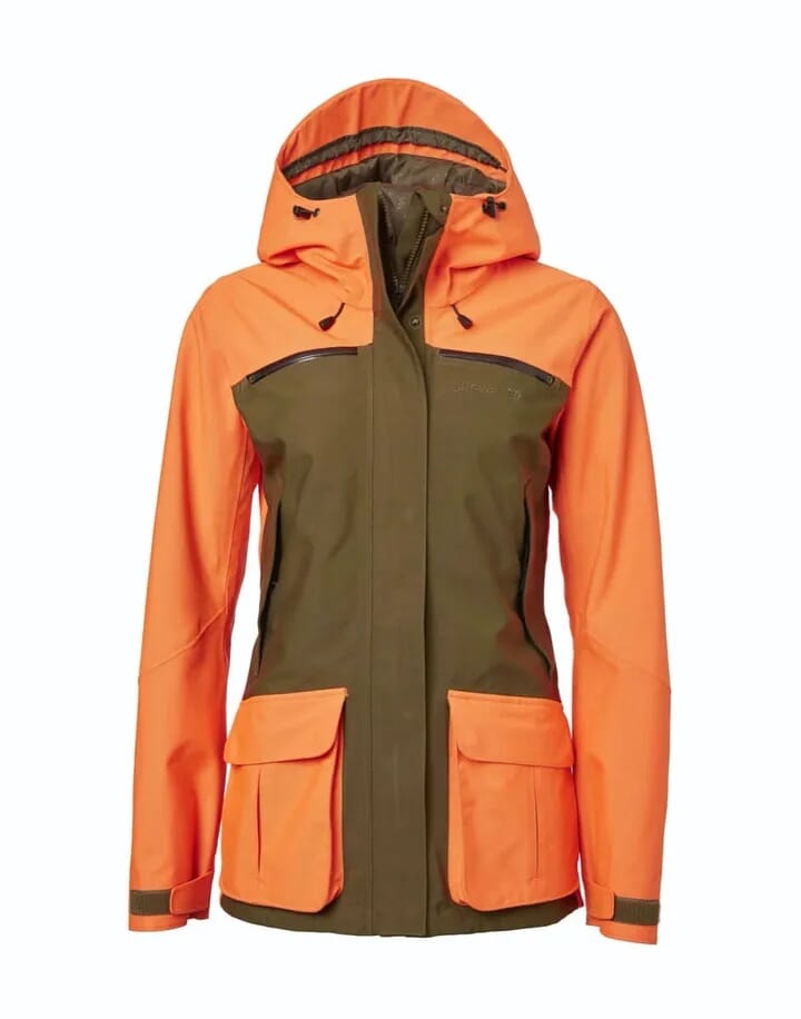 En veldig slitesterk jaktjakke til dame med high-vis oransje som oppfyller alle kravene for synlighet i terrenget.