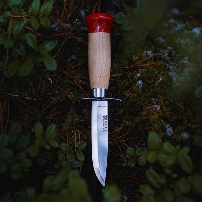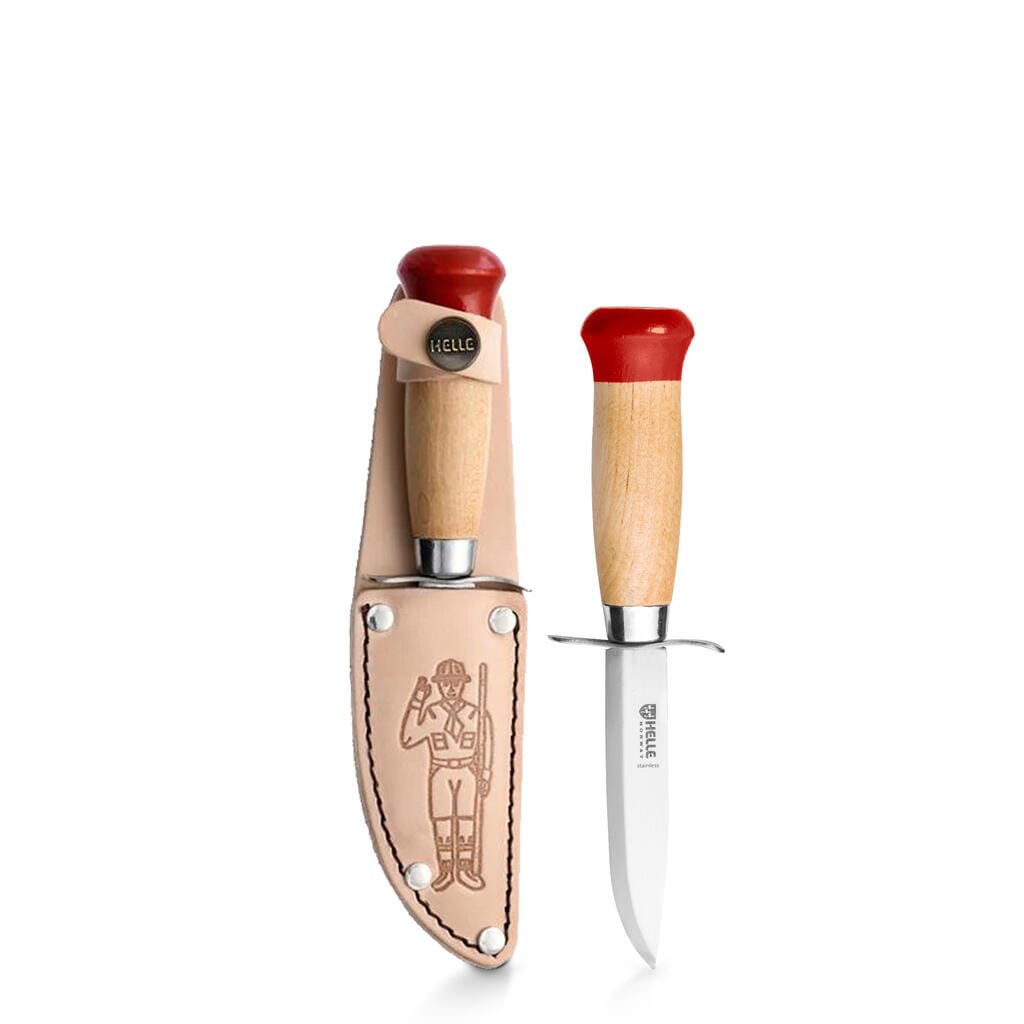 Helle Speiderkniv Gutt er den ideelle, tradisjonelle norske speiderkniven som er spesielt tilpasset barn i bever- og småspeideralderen. Den har et skaft laget av bjørk og et blad laget av rustfritt stål, noe som gjør den både funksjonell og holdbar. En ekstra god fingerbeskyttelse bidrar til sikkerheten under bruk, spesielt viktig når kniven håndteres av barn. Denne kniven leveres komplett med en lærslire, som ikke bare beskytter kniven når den ikke er i bruk, men også legger til et tradisjonelt preg på designet. En ekstra fordel med Helle Speiderkniv Gutt er at den er produsert i Norge, noe som understreker produktets kvalitet og autentisitet. Med sin pålitelige utførelse og tilpasning til unge speidere, er Helle Speiderkniv Gutt en flott introduksjon til speiderverdenen og utendørslivet for barn.
