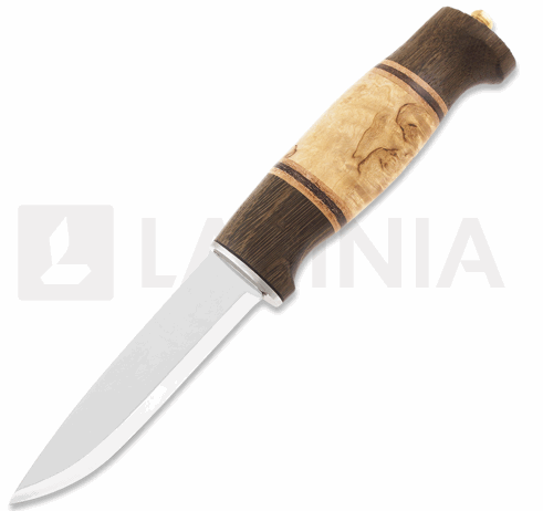 Kniven har et klassisk, tønneformet skaft laget med mørk eik, lær og masurbjørk sammen med en fremplate i rustfritt stpl.Knivbladet er formet som en liten drop-point og har Helles klassiske trelagsstål med høypolert finish.
