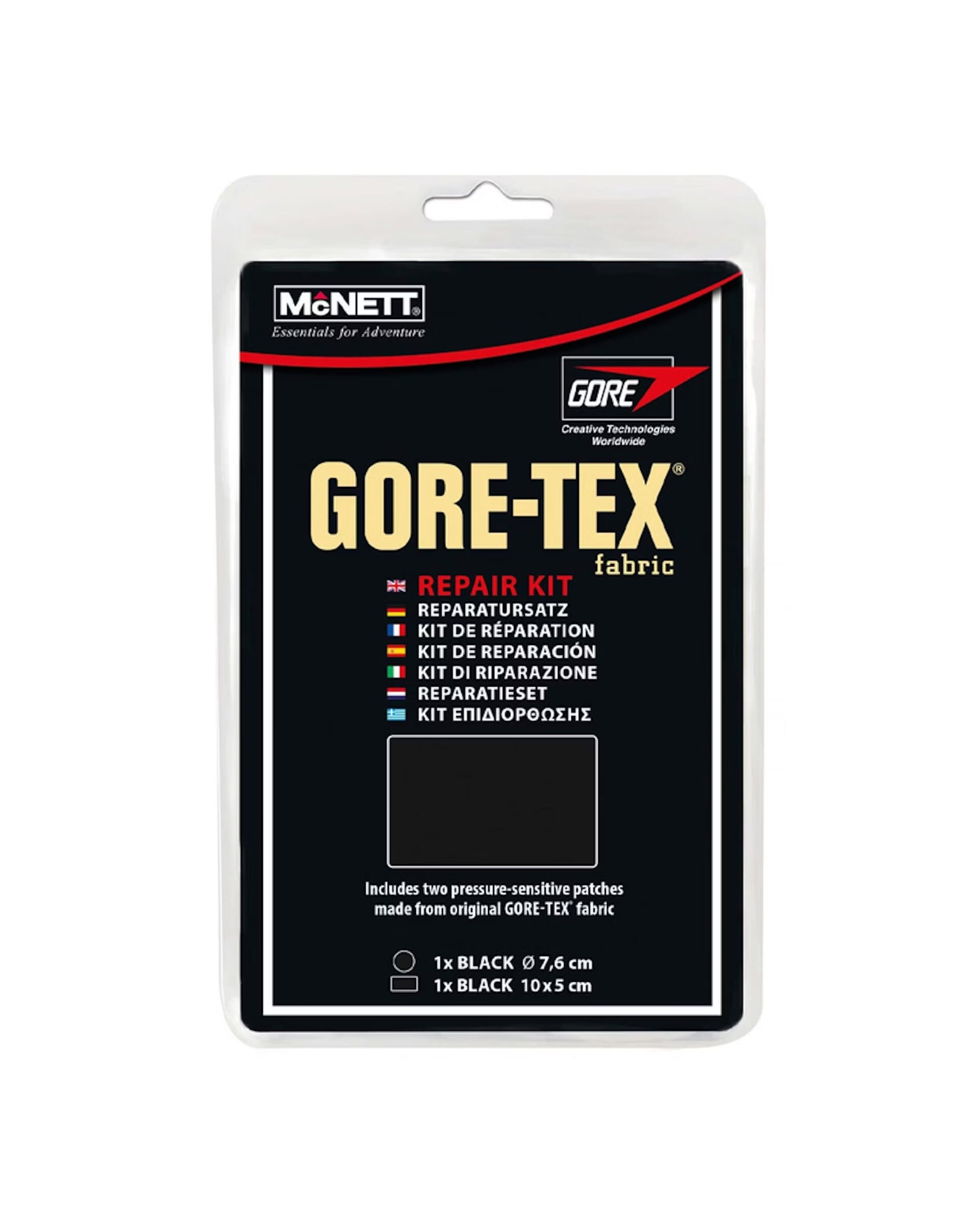 Settet inneholder to selvklebende lapper laget med originalt GORE-TEX stoff som gir en sterk-, fleksibel- og vanntett reparasjon av hul og rifter. Baksidens beskyttelsestape er enkel å fjerne, klipp evt lappen til ønsket fasong før du fjerner beskyttelsen. Reparert gjenstand kan benyttes umiddelbart.Passer for reparasjon av de fleste Gore-Tex produkter og andre plagg/fottøy med/uten pustende membran. Strykejern kan benyttes for en sterkere og permanent reparasjon. Settet inneholder 2 trykksensitive sorte lapper: 1 Rund (7,6 cm diameter) og 1 rektangulær (5 x 10 cm) Lappene er lette i vekt og veier kun 4gram.