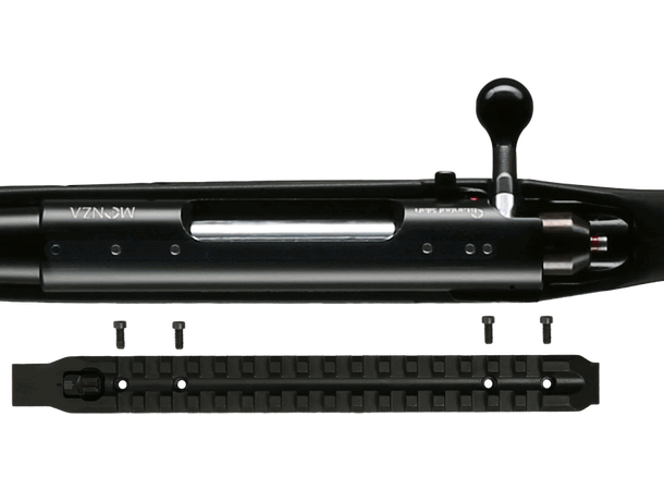 Kikkertmontering og Picatinny på forskjefte. Integrert picatinny-skinne som er avtagbar. Monza kommer klar til å installere forskjellige typer monteringsbaser når picatinny er tatt av. Leveres også med universal bipod-skinne på fremskjefte, som er kompatibel med det meste av tilbehør.