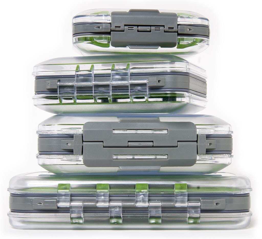 Double Silicone Fluebokser består av 4 modeller/størrelser som har samme konfigurasjon. Det er en silikonplate på hver side som holder sikkert på fluene, silikon har langt bedre grep enn slit foam, siden silikon har bedre grep så kan platene også være tynnere og allikevel holde kroken godt. Det gir bedre takhøyre/utnyttelse av plassen i boksen. Disse boksene egner seg i første rekke for tørrfluer og andre voluminøse fluer som du ikke ønsker skal bli klemt. Hver side åpnes separat og det er forsegling som sørger for at boksene tåler regn og vading uten at vannet lett siger inn.
