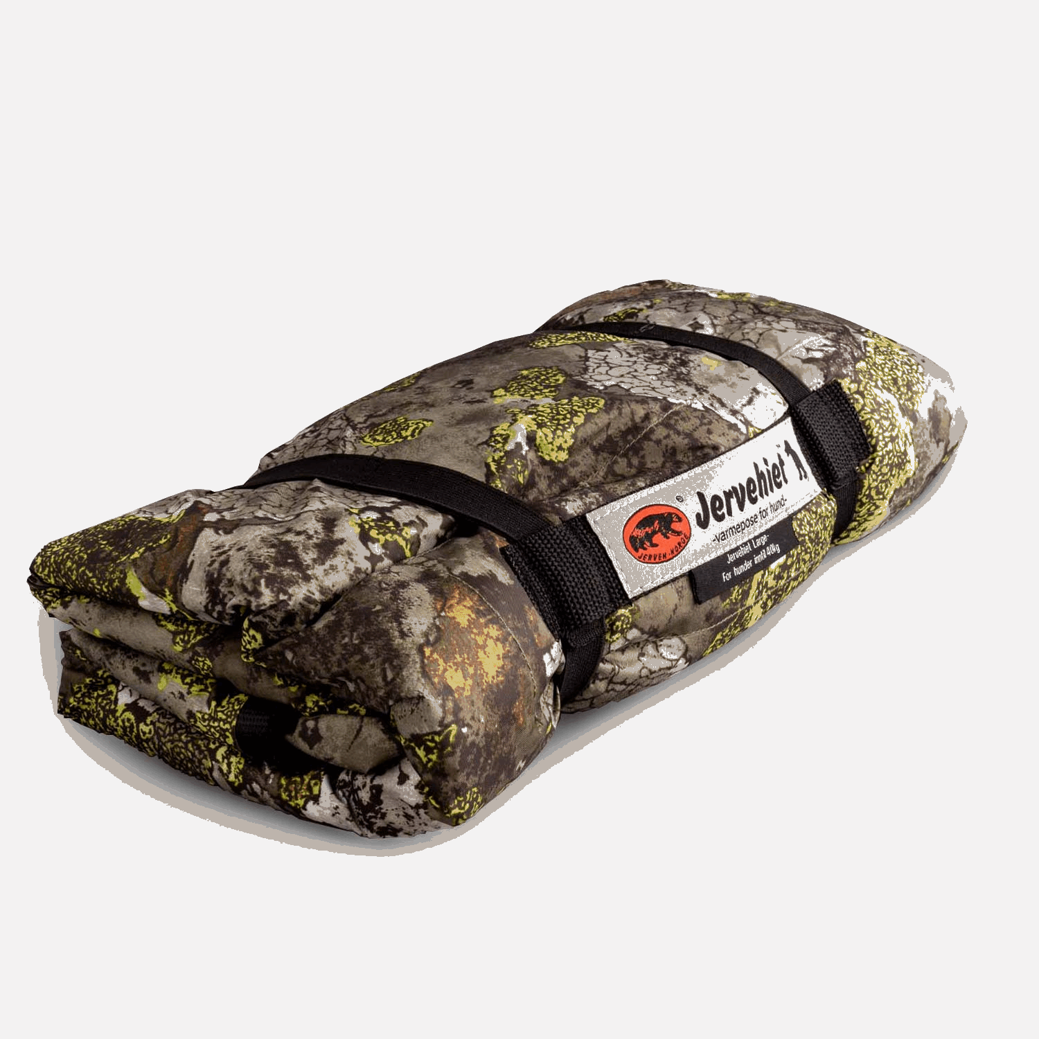Jervenduk for hunden. Når den firbente har behov for å hvile på turen, er Jervehiet perfekt. Ytterstoffet er det samme som i Jervenduken original, og er dermed både vann- og vindtett. Kombinerer du duken med thermofôr (vattering selges separat), har du en fleksibel og varm seng som hunden garantert vil sove godt i. Jervehiet er kompakt og lett å bære med seg i sekken. Jervehiet har en enkel snøreåpning, og duken er romslig slik at den kan brettes over hunden uansett hvordan den innretter seg.