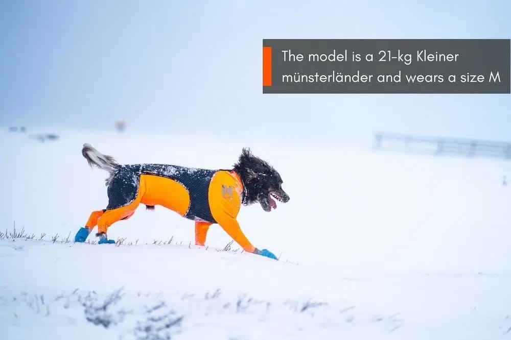 The four-way stretch fabric allows your dog to move freely and ensures a good fit. This full body snow suit is not insulated to provide warmth, but will help your dog stay warm as the coat insulates better when it is free of snow and ice.