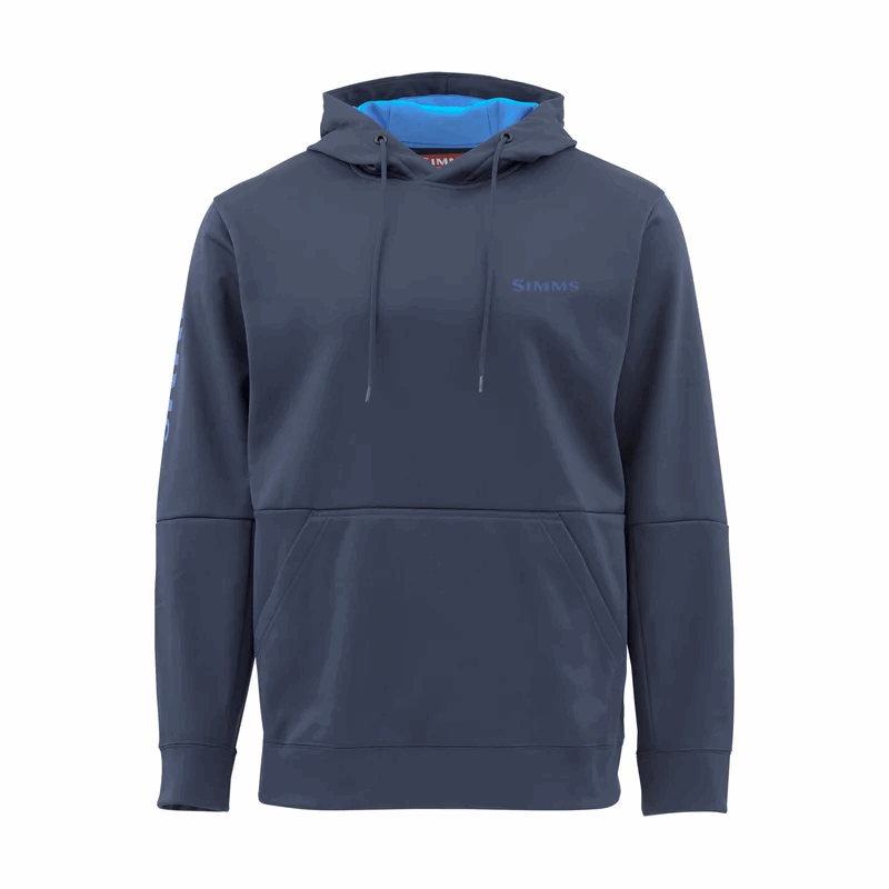 Simms Challenger Hoody Admiral Blue er en teknisk hettegenser som er laget for å tåle vær og vind. Genseren har en avslappet passform og er laget av polyester med en fleeceinteriør som gir varme og komfort. Den har to håndlommer, og en hette med strammesnor som kan justeres etter behov.