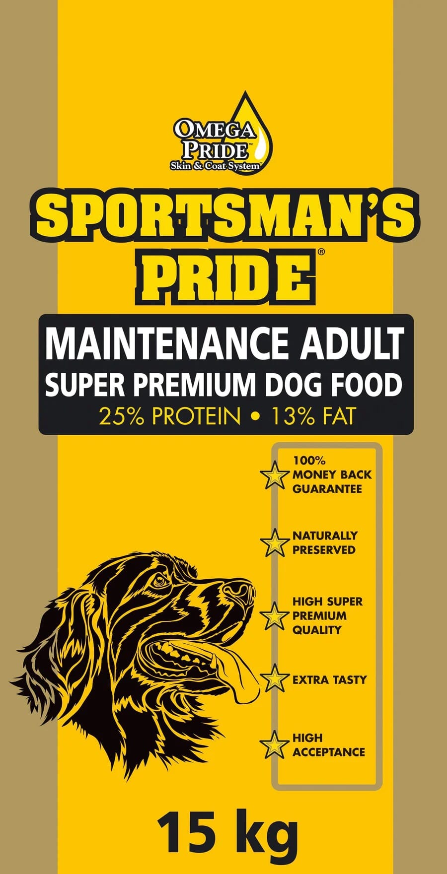 Sportsman's Pride Maintenance Gul - 15kg: Ideelt for familiehunden med lett til moderat aktivitetsnivå. Formulaen passer også meget godt for eldre hunder – og hunder som har lett for å gå opp i vekt. Et allsidig og velbalansert fòr av beste kvalitet.